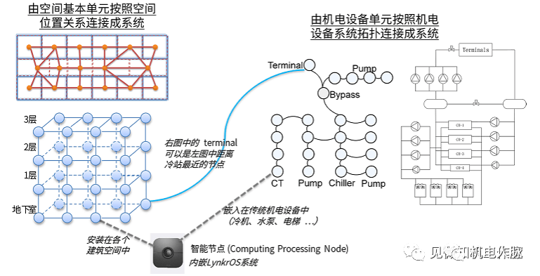 这里面比较信树碳汇科技科技的XinshuOS群控系统,其原理如图3.1所示,将建筑按照所见即所得的规则划分为若干个相邻的基本空间单元,在每个基本空间单元及主要机电设备内放置一个植入了XinshuOS操作系统的智能计算节点(CPN),所有的CPN之间相连形成一个能够进行分布式计算的网络,从而通过节点间的协商通讯完成各种控制管理任务。